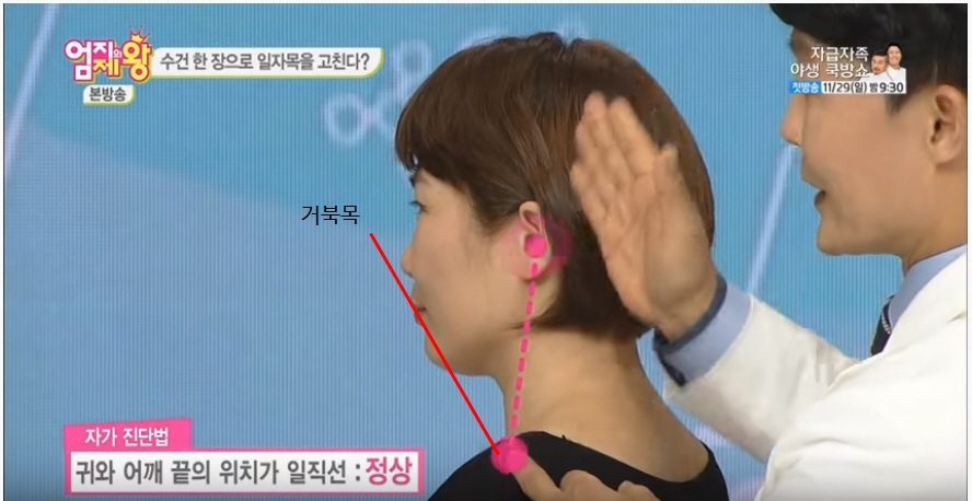 귀와 어깨 끝의 위치가 일직선이면 정상