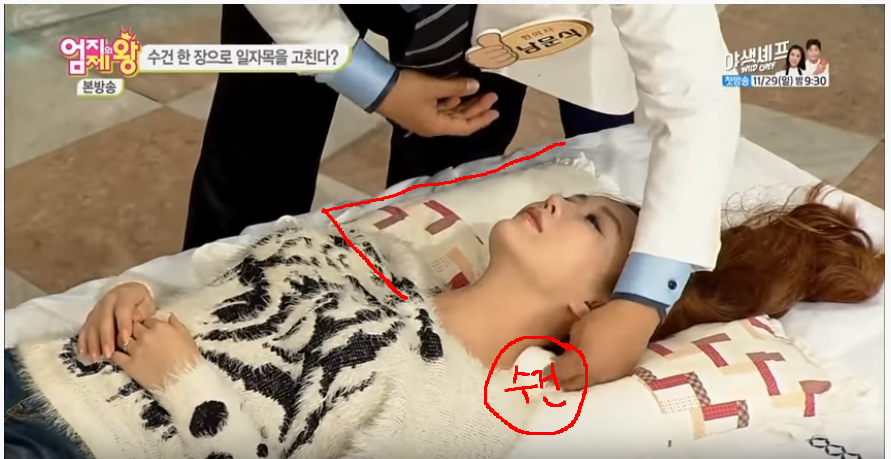 뒷목에는 수건 두 장,